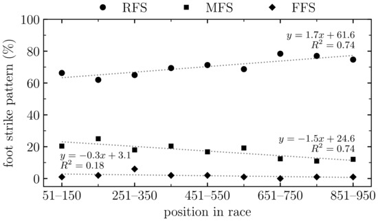 Prevalence of rearfoot strike (RFS), midfoot strike (MFS), and forefoot strike (FFS) patterns by position of individuals in race (groups of 100 runners) at the 10 km mark of the Singapore marathon. Dashed lines depict linear least square regressions together with the respective coefficient of determination (R2).