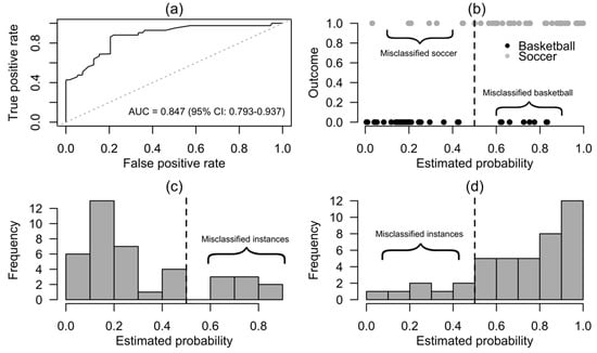 The bootstrapped AUC (0.847) value for the final model denotes that this relatively simple, four-variable final model displayed very good predictive power for the distinction of the original groups. The final model demonstrated that membership to the soccer group could be strongly related to IMP