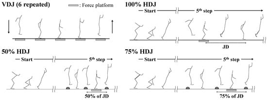 Data were collected at an outdoor track and field stadium. To ensure that every individual received adequate warm-up, the individuals were free to follow their own style and duration of warm-up (consisting of jogging, static and dynamic stretching, and various jumps) for approximately 30–60 min. After a warm-up period, the participants performed VDJ, 50% HDJ, 75% HDJ, and 100% HDJ (Figure 1). Each jump was performed at least twice. Jumps consisted of six repeated rebound jumps in the vertical or horizontal direction with a double-leg take-off from a standing posture. For VDJ, the participants were instructed to maintain the contact time as short as possible and to jump as high as possible [,]. The 100% HDJ commenced from a double-leg standing position, and the participants were instructed to maintain the contact time as short as possible and to jump as far as possible, by performing a series of six forward double-leg jumps. In the 50% HDJ and 75% HDJ, the markers were set at equal intervals of 50% and 75% of jump distance in 100% HDJ, respectively. In 50% HDJ and 75% HDJ, participants were instructed to maintain the contact time as short as possible and to jump as high as possible between the markers by performing a series of six forward double-leg jumps. Based on previous testing sessions, the starting mark for each horizontal jump (50% HDJ, 75% HDJ, and 100% HDJ) was used to allow the participants to strike a force plate at the fifth step without altering their technique immediately before reaching the plate. All participants wore personal training shoes (without spikes) during the experiment. Participants rested as often as they felt necessary between trials to reduce the effects of fatigue.