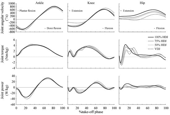 Average patterns of joint angular velocity, joint torque, and joint power for the ankle, knee, and hip joint. %take-off phase, normalized time series data to take-off phase time (0–100%); VDJ, vertical double-leg rebound jump; 50% HDJ, horizontal double-leg rebound jump for 50% of jump distance performed in 100% HDJ; 75% HDJ, horizontal double-leg rebound jump for 75% of jump distance performed in 100% HDJ; 100% HDJ, horizontal double-leg rebound jump.
