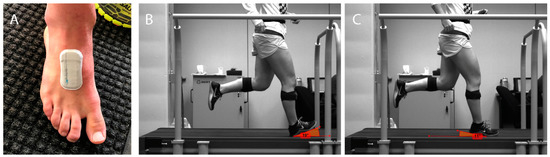 (A) BiostampRC sensor attached to the dorsal surface of the foot to determine sensor based foot strike angle (FSASENSOR) and foot strike classification (FSCSENSOR). (B,C) View from camera showing the participant running on treadmill. This view was used by human raters to determine the foot strike angle from the video (FSAVIDEO) and the foot strike classification from video (FSCVIDEO). The image on the left (B) shows an example of FSAVIDEO = 19° and FSCVIDEO = rearfoot (RF). On the right (C) is an example of FSAVIDEO = −11° and FSCVIDEO = forefoot (FF).