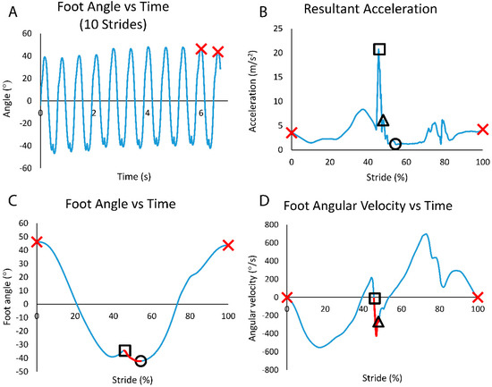 BiostampRC sensors: All data were downloaded and processed via custom MATLAB code (Mathworks, Inc., Natick, MA). Sagittal plane gyroscope data were integrated to get the foot angle. From the foot angle data, it was possible to determine a stride, which was defined as the period from the maximal foot angle magnitude to the next maximal foot angle magnitude (Figure 2A). Visual observation indicated that the time of the maximal foot angle magnitude coincided with the start of the foot forward swing, and that foot strike occurred somewhere in the middle of this strike period. Foot strike was then determined from the 3D accelerometer data by calculating the peak of the resultant acceleration in each stride period (Shiang et al., 2016) [16] (Figure 2B):