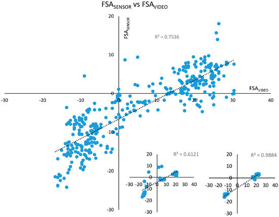 FSASENSOR (y-axis) plotted against FSAVIDEO (x-axis). There was a very strong and significant correlation between FSASENSOR and FSAVIDEO (r = 0.868, p < 001). Inserts: Within participant data showed significant correlations with r = 0.832 (p < 001) for the worst case (left insert) and r = 0.994 (p < 001) for the best case (right insert).