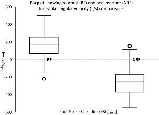 Boxplot showing differences in average angular velocity at foot strike (ωFS(0–15ms)) for different foot strike classification made by human raters using 2D videography data (FSCVIDEO). There was a significant difference between ωFS(0–15ms) for RF and NRF (t = 27.591, p < 001).