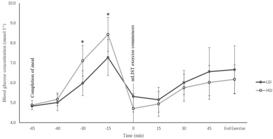 Figure 2. Measurements of blood glucose concentration over the duration of the experimental session. LGI = low glycaemic index; HGI = and high glycaemic index; * p < 0.01, significantly different between LGI and HGI meal trials