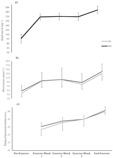 Figure 3. Heart rate (a), blood lactate (b) and ratings of perceived exertion (c) measures in the low glycaemic index (LGI) and high glycaemic index (HGI) meal trials during the modified Loughborough Intermittent Shuttle Test exercise.