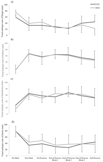 Figure 4. Subjective ratings of hunger (a), fullness (b), satisfaction (c) and satiety (d) in the low glycaemic index (LGI) and high glycaemic index (HGI) meal trials at pre- and post-meal ingestion and throughout the exercise duration.