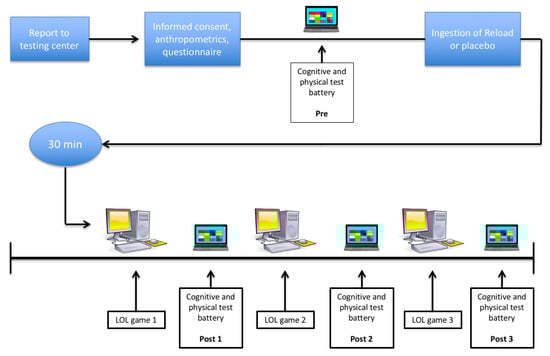 A schematic representation of the study procedures is shown in Figure 1. After signing their informed consent, participants were assigned to their respective treatment conditions (described below) in a randomized, double-blind, counter-balanced, cross-over and placebo-controlled manner. Cognitive and physical measures were performed four times per testing day: prior to and after each of three consecutive LoL games. Each game was separated by 15 min for testing procedures and strategic debriefing pertaining to game play. The use of three games was chosen to emulate the best-of-three game format that the players typically compete in. Testing days occurred one week apart, at the same time of day (approximately 13:00) in a well-lit environment. Room temperature was maintained at between 21 and 23 °C. The subjects were instructed to abstain from all caffeine sources on the mornings prior to testing.