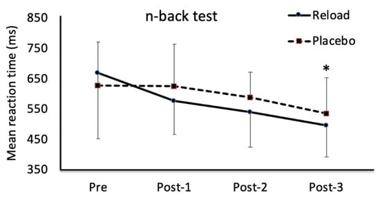 Mean (95% confidence intervals (CI)) reaction time for n-back test for Reload and placebo. * indicates a significant decrease for Reload at Post-3 compared with pre time point (p = 0.004).