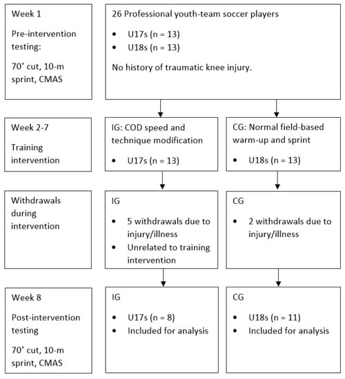 A non-randomized, controlled 6-week intervention study with a repeated-measures pre-to-post design was used. Youth soccer players (U17s) from an English professional soccer club were recruited for the IG, which consisted of a 6-week COD speed and technique modification training programme (Table S1), consisting of two, 20-min sessions per week. These sessions replaced the soccer teams’ normal warm-ups for two of the sessions, which consisted of mobilisation, low-level jump-landing and sprint drills. Conversely, youth soccer players from the same club (U18s) acted as the CG and continued their normal field-based warm-ups. Pre-to-post assessments of 70° cutting COD speed performance, 10 m sprint times, and COD deficit were assessed to monitor the effectiveness of the training intervention, while cutting movement quality was assessed with the recently developed and validated CMAS screening tool [29,30].