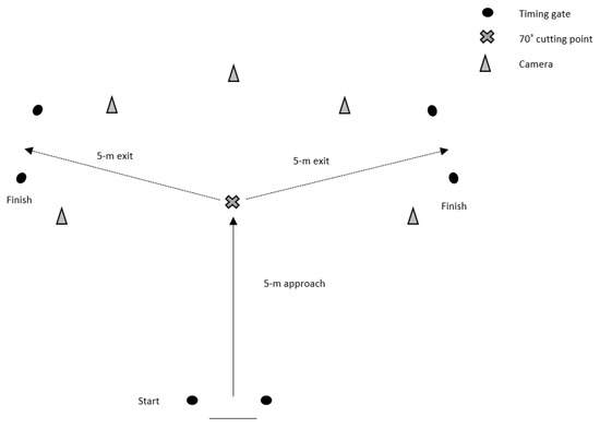 The cutting task consisted of a 5 m approach, 70° cut, and 5 m exit towards the finish (Figure 2). Completion time was measured using sets of single-beam (accuracy to 1/1000th of a second) Brower photocell timing Gates (Draper, UT, USA), which were setup at the start and finish (Figure 2); time was recorded to the nearest 0.001 s. Timing gates were placed at the approximate hip height for all athletes, to ensure that only one body part breaks the beam. Participants started 0.5 m behind the first gate, to prevent any early triggering of the initial start gate, from a two-point staggered start, and were instructed to sprint as fast as possible, cut (lateral foot plant), and reaccelerate as fast as possible through the finish (Figure 2). Participants performed four practice trials at 75% of maximum perceived effort, before performing six maximum-effort cutting trials: three changing direction with a left foot plant, and three changing direction with a right foot plant, interspersed with two-minutes’ rest between trials. The testing order was counterbalanced. If the participants’ foot did not touch the cutting line (i.e., cut prematurely), slipped, turned off the incorrect foot, or did not perform a side-step cutting action, the trial was disregarded, and another trial was performed following the rest period. The mean of three trials from each limb was used for further analysis [34]. To permit qualitative screening of the cutting technique, three Panasonic Lumix FZ-200 high-speed cameras (Osaka, Japan) sampling at 100 Hz filmed the cutting trials. These cameras were positioned on tripods 3.5 m away from the cutting point at a height of 0.60 m and were placed in the sagittal and frontal plane, with a camera also placed 45° relative to the cut (Figure 2) [30].