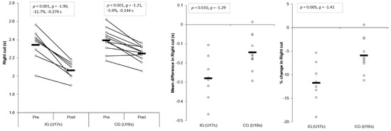 Large and significant main effects for time were found for right cut completion time (p < 0.001, η2 = 0.829, power = 1.000). In addition, a large and significant interaction effect of time and group for right cut completion time was also observed (p = 0.010, η2 = 0.330, power = 0.779), with the IG showing significantly faster post-intervention completion times (p < 0.001, g = −1.94) compared to the CG. Moreover, large and significant improvements in right cut completion times were observed for the IG (p < 0.001, g = −1.90, −11.7%, −0.279 s) and CG (p < 0.001, g = −1.21, −5.9%, −0.144 s) (Table 3 and Table 4, Figure 3) post-intervention, which were greater than the SEM and SDD. Mean (p = 0.010, g = −1.29) and percentage (p = 0.005, g = −1.41) improvements were significantly greater for the IG compared to CG, with large effect sizes (Figure 3).