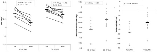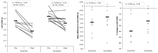 Large and significant main effects for time were found for left CODDs (p < 0.001, η2 = 0.606, power = 0.998). Although a small, non-significant interaction effect of time and group for left CODD was observed (p = 0.316, η2 = 0.059, power = 0.164), the IG displayed significantly shorter post-intervention left CODDs (p = 0.011, g = −1.27) compared to the CG. Moreover, a large and moderate, significant improvement in left CODDs was observed for the IG (p = 0.012, g = −1.63, −39.1%, −0.187 s) and CG (p = 0.013, g = −1.17, −21.7%, −0.124 s) post-intervention, respectively (Table 3 and Table 4, Figure 6). These changes were greater than the SDD for the IG only. Although non-significant, mean (p = 0.316, g = −0.46) and percentage (p = 0.062, g = −0.78) improvements were slightly greater for the IG compared to the CG, with a small and moderate effect size (Figure 6), respectively.