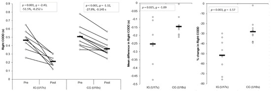 Large and significant main effects for time were found for right CODDs (p < 0.001, η2 = 0.839, power = 1.000). In addition, a large and significant interaction effect of time and group for right CODD was also observed (p = 0.025, η2 = 0.262, power = 0.639), with the IG displaying significantly shorter post-intervention right CODDs (p = 0.001, g = −1.79) compared to the CG. Moreover, a very large and large, significant improvement in right CODD was observed for IG (p = 0.001, g = −2.43, −51.5%, −0.252 s) and CG (p < 0.001, g = −1.32, −27.9%, −0.145 s) post-intervention, respectively (Table 3 and Table 4, Figure 5). These changes were greater than the SDD for the IG only. Mean (p = 0.025, g = −1.09) and percentage (p = 0.003, g = −1.57) improvements were significantly greater for the IG compared to the CG, with moderate and large effect sizes (Figure 5), respectively.