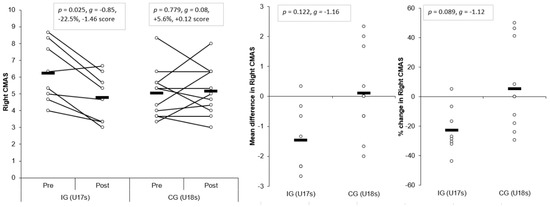 Large and significant main effects for time were found for right CMAS (p = 0.041, η2 = 0.224, power = 0.551). In addition, a large, significant interaction effect of time and group for right CMAS was also observed (p = 0.018, η2 = 0.287, power = 0.694), with the IG showing slightly lower post-intervention right CMASs (p = 0.001, g = −0.26) compared to the CG. A moderate and significant improvement in right CMAS was observed for the IG (p = 0.025, g = −0.85, −22.5%, −1.46 score) following the intervention, whereas the CG demonstrated no significant and trivial changes in right CMAS post-intervention (p = 0.779, g = 0.08, +5.6%, +0.12 score) (Table 3 and Table 4, Figure 7). These changes were greater than the SDD for the IG only. Although non-significant, mean (p = 0.122, g = −1.16) and percentage changes (p = 0.089, g = −1.12) were greater for the IG compared to CG, with moderate effect sizes (Figure 7).