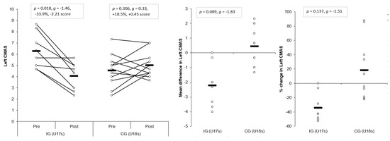 Large and significant main effects for time were found for left CMAS (p = 0.015, η2 = 0.302, power = 0.725). In addition, a large and significant interaction effect of time and group for left CMAS was also observed (p = 0.001, η2 = 0.499, power = 0.972), with the IG showing lower post-intervention left CMASs (p = 0.318, g = −0.77) compared to the CG. A large, significant improvement in left CMAS was observed for the IG (p = 0.018, g = −1.46, −33.9%, −2.21 score) following the intervention, whereas the CG demonstrated no significant and small changes in left CMAS post-intervention (p = 0.306, g = 0.33, +18.5%, +0.45 score) (Table 3 and Table 4). These changes were greater than the SDD for the IG only. Although non-significant, mean (p = 0.089, g = −1.83) and percentage changes (p = 0.137, g = −1.51) were substantially greater for the IG compared to CG, with large effect sizes (Figure 8).