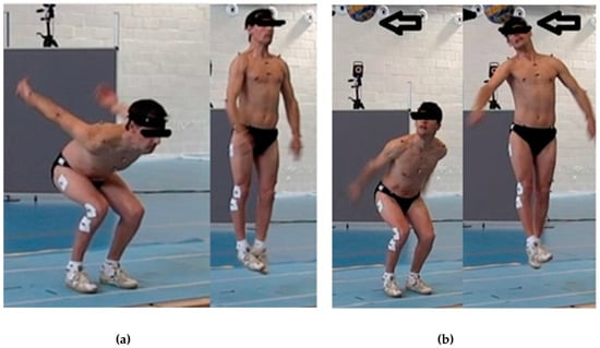 Studies published in the scientific literature addressing vertical jumping ability in football players with CP have assessed vertical jumps from a kinetic perspective [,,,]. So far, there are no studies addressing football players with CP to assess vertical jumping ability using kinematic methods, as well as more specific vertical jumps performed in the game, such as CMJAS with a header. The results obtained in the present study have indicated differences between CMJAS and CMJAS with a header performed by players with CP. It has been observed that CMJAS with a header implies a lower angle of the hip measured at the moment of maximum flexion in both the dominant and the non-dominant side. In addition, in the jumps with a header, the players exhibited a lower angle of the knee measured at the moment of maximum flexion. However, in the jumps with a header, the players reached higher values of ankle extension. These results indicate that there were differences in the kinematics of jumps between CMJAS and CMJAS with a header. According to the results obtained, players with CP tend to flex less in the eccentric phase of CMJAS with a header in comparison to CMJAS, perhaps as a preparatory mechanism due to the need to direct the body towards the ball. On the other hand, also from the perspective of kinematic analysis, it has been observed that the asymmetries (D-ND) of the ankle flexion are accentuated in jumps with a header in comparison to CMJAS. These results partially coincide with those obtained by Wagner et al. []. These authors also observed that the use of the ball, simulating a header, would cause greater asymmetry in the jumps. It seems that football players with CP increase the asymmetry of the ankle flexion in jumps with a header. It would be reasonable to think that the precision demanded by a jump with a header could condition these asymmetries, and the players could make adjustments in the direction of their jumps at the time of the take-off. These differences between both jumps should be taken into account by coaches and physical trainers of football players with CP in order to adapt the training to the specific demands of football.