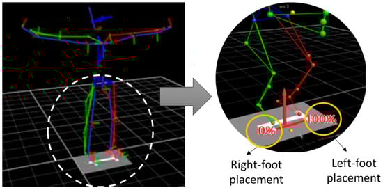 Prior to data collection, 35 passive reflective markers (Vicon, Oxford, UK) of 12 mm diameter were placed on each participant, adjusted to the “plug-in-gait full body” model []. The same experienced researcher placed the markers to all participants. We used a 3D optical motion capture system consisting of 7 cameras (T10 series, Vicon MX, Oxford, UK) recording at a 200 Hz frequency and synchronized through Nexus v1.7 software (Vicon MX, Oxford, UK). In order to obtain the trajectories of the markers during the jumps, all the records were reviewed, and the gaps filled in for sporadic losses of the markers using the tools of the Nexus software. Subsequently, a double 2nd order Butterworth filter with a cut-off frequency of 6 Hz was applied to the trajectories and the plug-in-gait model was reconstructed to calculate the joint angles from the positions of the markers. The angles of the shoulders, hips, knees, and ankles were calculated in the sagittal plane for both the dominant (D) and the non-dominant (ND) sides. Both D and ND sides were identified according to the following criteria: i) the leg with a higher degree of impairment (e.g., spasticity) and/or ii) the leg used for passing and kicking as per players report. As relevant variables of the angles of the lower limbs, the values were extracted at the moment of maximum knee flexion and at the time of take-off, determined by the decrease in the vertical force below a threshold of 20 N. In addition, we calculated the range of motion (ROM) in the shoulders during the jumps. As a postural control variable in the jumps, we measured the symmetry of the location of the centre of pressures at the instant of maximum vertical force. The width of the support base was defined as a reference, delimited by the toe markers (placed at the 2nd metatarsal bones), assigning 0% to the position of the right foot and 100% to that of the left foot (Figure 2). It was considered that a balanced jump was one in which the centre of pressure was around 50% with respect to the support base. The average of the values of each variable in the five jumps performed with and without a header was used to analyse the data. In addition, the index of asymmetry between the D and the ND sides in each of the variables was calculated using the following formula: Asymmetry = (ND − D) × 100/D [].