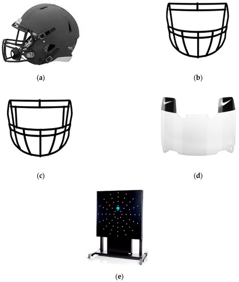 Dynavision and Football Headgear Equipment: (a) Riddell Speed Icon Helmet, (b) Riddell S2BD-SP facemask. (c) Riddell S2EGII-SP facemask. (d) Nike Gridiron Eye shield 2.0. (e) Dynavision D2 Visuomotor Board.