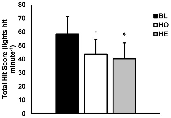 Mean total hit score (lights hit · minute−1) is presented in Figure 2. Analysis revealed a main effect for condition (p < 0.001; ηp2 = 0.74). Multiple comparisons showed t ttotal hit score was significantly higher during the BL versus HO condition and HE conditions (BL = 58 lights hit · minute−1 ± 12, HO = 43 lights hit · minute−1 ± 10, p < 0.001; d = 1.25; HE = 40 lights hit · minute−1 ± 11, p < 0.001; d = 1.47). No significant differences were found for mean total hit score between HO and HE (p = 0.226; d = 0.30).