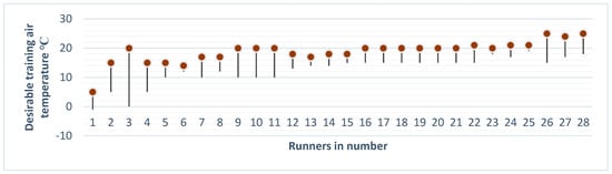 Figure 1. Convenient training air temperature for each runner (n = 28). - Sixteen runners (57%) reported no previous diseases, while four had pulmonary diseases, including asthma. One suffered from Reynaud’s disease; two runners had high blood pressure; two were allergic; one had diabetes; one cardiovascular disease; one suffered from depression; and one runner reported kidney disease and hypotension.