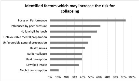 - The most common extrinsic factor before collapsing was high temperature, followed by uphill slope, public cheers, public behavior, narrow track, crowding, and relative bystanders.