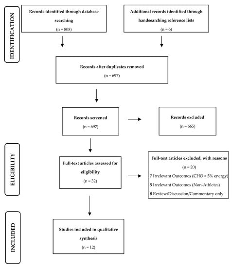 The search revealed a total of 814 articles related to the search terms, however, only 12 articles met each of the criteria stipulated for article inclusion (see Figure 1). After removing 117 duplicate articles, a further 665 articles were also deemed unsuitable for inclusion, as these involved non-athletic populations, included carbohydrate intakes >5% total energy intake, or involved dietary protocols that were <21 days in duration. The topics that were included in the final review were body composition, physical health, sports performance, and athlete well-being.