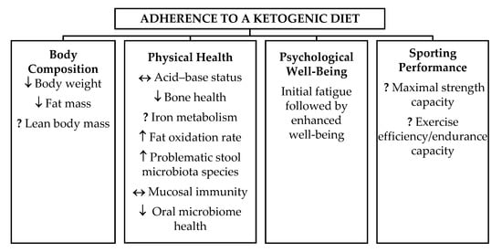 After reviewing each of the articles selected for inclusion in this review, it was evident that equivocal results existed regarding adherence to a KD. Figure 2 provides a brief summary of the effects of a KD on various health and well-being outcomes. A KD was seen to exhibit desirable effects on body weight and fat mass in athletes [,], however, the effect on lean body mass is yet to be confirmed. No adverse health outcomes were observed on the acid-base status [] or mucosal immunity [] of athletes but increases in potentially problematic stool microbiota species [] were identified. Adherence to a KD tended to have detrimental effects on endurance performance [,] but further research is required to determine the true effect of a KD on actual sporting performance.