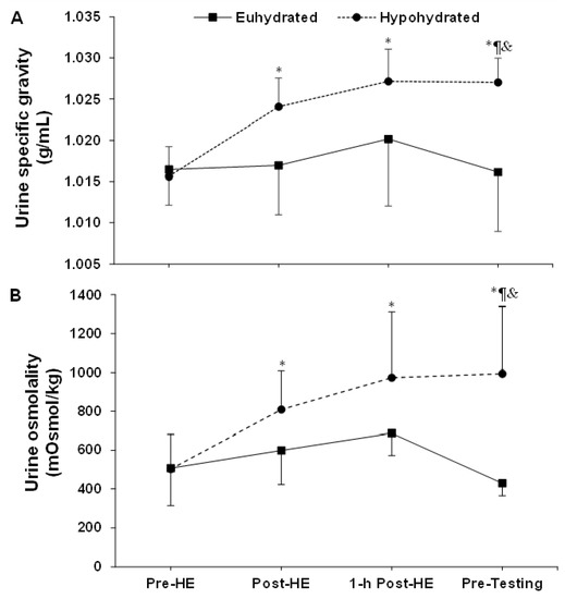 Changes in urine specific gravity (A) and osmolality (B) during the experiments. *: time effect; ¶: condition effect; &: interaction effect. Pre-HE: pre-heat exposure; Post-HE: post-heat exposure. Results are means ± SD.
