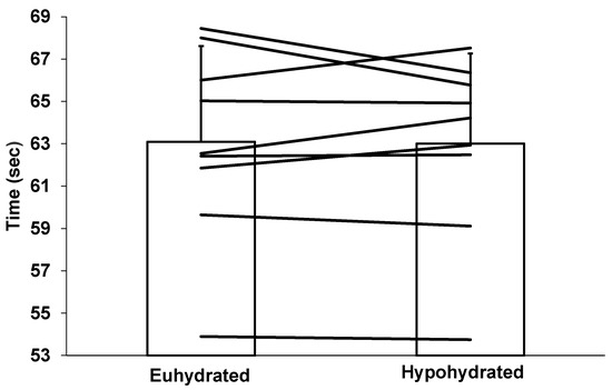 There was no order effect (p = 0.52) in performance. The inter-rater reliability for the 100 m front crawl time measurement was perfect at r = 1.00. There was no difference in 100 m front crawl performance between the euhydrated (63.09 ± 4.52 s) and hypohydrated (63.00 ± 4.26 s) condition (p = 0.86), as demonstrated in Figure 3. The day-to-day CV for the 100 m front crawl performance was 0.38%, whereas the percent change in performance between conditions was 0.13 ± 2.15%.