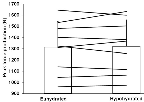 Absolute peak force production on the starting block for the euhydrated and hypohydrated condition. Horizontal lines represent individual changes in performance. Vertical columns represent mean performances with SD.