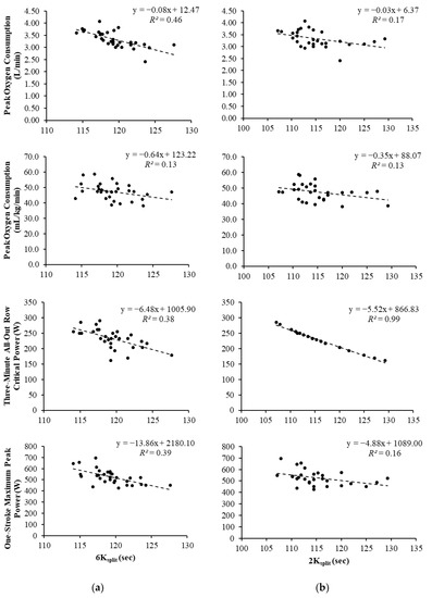 Scatterplots representing the relationship between 6K/2K split times and fitness tests. (a) 6Ksplit = 500 m split time for 6000 m row; (b) 2Ksplit = 500 m split time for 2000 m row.