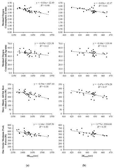 Scatterplots representing the relationship between 6K/2K completion times and fitness tests. (a) 6Ktotal = 6000 m row completion time; (b) 2Ktotal = 2000 m row completion time.