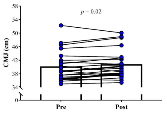 Comparison of the countermovement jump height (CMJ) pre and post 26 days of detraining in under-20 soccer players. The significance level was set as p < 0.05.