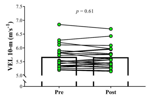 Comparison of the 10 m sprint velocity (VEL) pre and post 26 days of detraining in under-20 soccer players. The significance level was set as p < 0.05.