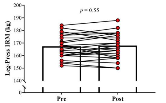 No significant change in the BM was observed between pre- and post-assessments (Pre: 70.9 ± 6.1 kg; Post: 71.1 ± 7.4 kg; p = 0.92, ES = 0.03). Soccer players demonstrated a significant increase in CMJ performance after the training cessation period (Pre: 40.0 ± 4.3 cm; Post: 40.6 ± 4.1 cm; p = 0.02; ES = 0.15; Figure 1). No significant differences were found after 26 days of detraining for 10 m sprint velocity (Pre: 5.66 ± 0.40 m·s−1; Post: 5.64 ± 0.39 m·s−1; p = 0.61, ES = 0.03, Figure 2) and 1RM leg-press (Pre: 166.8 ± 9.2 kg; Post: 167.4 ± 10.2 kg; p = 0.55, ES = 0.06, Figure 3).
