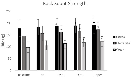 All dependent variables met the assumptions of normality and sphericity at the level of significance. When investigating the relative rates of change in performance between groups, several distinctions can be made. In dynamic strength, for example, both the moderate and weak groups showed their greatest change from baseline to the end of the SE phase (Table 6). However, the strong group showed its greatest improvement from the end of SE to the end of the MS phase. Similar trends were found for relative dynamic strength but with the strong group’s greatest improvement from the end of the FOR to the taper phase. Taken together with all performance variables, there is a clear difference in rates and timing of adaptation to a stimulus between strength groups.