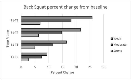 Both weighted and unweighted vertical jumps were measured before and after each block of training. The 0 kg SJ showed a statistically significant main effect for time increase in jump height (p < 0.001). While there were not statistically significant differences between groups for 0 kg, the strong group improving 7.6%, the moderate group improving only 0.3%, and the weak group improving 25.6% over the course of the study. It is worth noting that two subjects in the moderate group improved (4.8 cm and 2.3 cm, respectively) while two decreased (−3.9 cm and −2.9 cm, respectively) likely confounded the overall group mean. Similar results were found for the 0 kg CMJ with a significant effect for all subjects over the course of the study (p < 0.001) and non-significant differences between groups. However, noticeable differences in the percent changes were noted with the strong group improving 9.9%, moderate group improving 11.0%, and the weak group improving 23.8% over the course of the study.