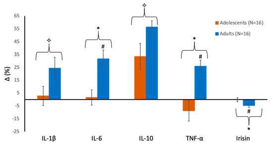 Figure 1 shows the percent changes in the various cytokines from pre- to post-swimming in each group. IL-1β showed a significant effect for time (F = 6.47; p = 0.016; partial η2 = 0.18), reflecting an overall large increase from pre to post-exercise, with no significant group effect (F = 0.00; p = 0.99; partial η2 = 0.00) and no significant group-by-time interaction (F = 2.87; p = 0.10; partial η2 = 0.09). Thus, although IL-1β increased by 3% in adolescents versus 24% in adults, this difference was not statistically significant (Figure 1). IL-6 showed no significant group effect (F = 1.14; p = 0.29; partial η2 = 0.03), but a significant time effect (F = 14.11; p = 0.001; partial η2 = 0.32) and a large, significant group-by-time interaction (F = 9.75; p = 0.004; partial η2 = 0.25), reflecting a significant increase following intense swimming in the adult swimmers (+32%, p = 0.002), which was not the case in adolescents (Figure 1). There was a large, significant increase over time for IL-10 (+34% and +56% in boys and men, respectively; F = 40.6; p = 0.001; partial η2 = 0.57), with no significant group effect (F = 0.49; p = 0.49; partial η2 = 0.01) or group-by-time interaction (F = 0.99; p = 0.33; partial η2 = 0.03). For TNF-α, we found no effect for group (F = 2.61; p = 0.12; partial η2 = 0.08), a significant time effect (F = 9.16; p = 0.005; partial η2 = 0.23), and a significant group-by-time interaction (F = 16.37; p = 0.001; partial η2 = 0.35), which reflects a significant increase in the adults (+26%, p < 0.001) with a non-significant decrease (−9%, p = 0.47) in the adolescents (Figure 1). A significant main effect for time (F = 4.71; p = 0.038; partial η2 = 0.14), but not for the group (F = 0.29; p = 0.59; partial η2 = 0.01), and a significant interaction (F = 4.92; p = 0.034; partial η2 = 0.14) were also found for irisin, reflecting a small yet significant decrease in adults (−5%, p = 0.03), with no change in the adolescents (Figure 1).