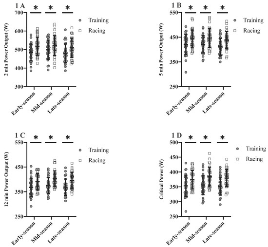 Differences in the absolute power profile between training and racing across periods; (A)—2-min power output, (B)—5-min power output, (C)—12-min power output, (D)—critical power. * significantly different between training and racing (p ≤ 0.05).