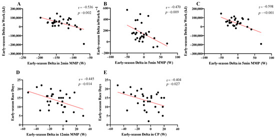 Relationship between the change in the power profile and training characteristics for the ∆ early- vs. pre-season. MMP—mean maximum power, CP—critical power; (A)—Work and 2 min MMP, (B)—Work⋅h−1 and 5 min MMP, (C)—Work and 5 min MMP, (D)—Race Days and 12 min MMP, (E)—Race Days and CP.
