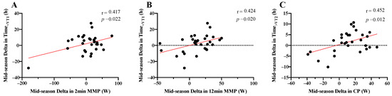 The ∆ in 2 and 12 min MMP between mid- and early-season significantly correlated with the ∆Time<VT1 (r = 0.41, p = 0.022; r = 0.42, p = 0.020—Figure 4A,B). The ∆ in CP between mid- and early-season significantly correlated with ∆Time>VT2 (r = 0.45, p = 0.012, Figure 4C).
