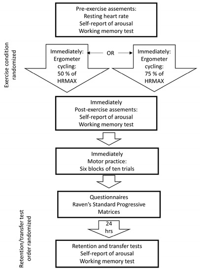 Thus, theoretical frameworks postulate positive effects of moderate intensity exercise on motor learning. Moreover, a mixture of findings has emerged in previous works that have investigated the effects of aerobic exercise on motor learning. Based on the presented considerations, the current study set out to further examine if acute aerobic exercise conducted at moderate-to-vigorous intensity leads to different rates of motor acquisition, transfer, and retention. Assessments of working memory and self-reported arousal were also included in order to establish whether the exercise introduced the theoretically expected cognitive effects.