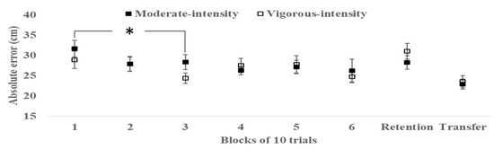 Putting accuracy (lower scores indicate greater accuracy) of the moderate intensity and vigorous intensity groups during motor practice, 24-h retention, and transfer. Error bars indicate standard errors. * Main effect of block (p < 0.01).