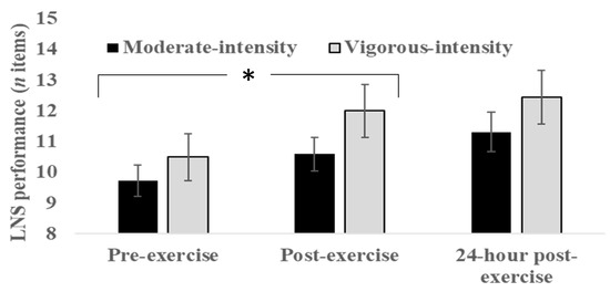 Working memory performance of the moderate intensity and vigorous intensity groups before and immediately after exercise, and at 24-h post exercise. Error bars indicate standard errors. * Main effect of exercise (p < 0.01).