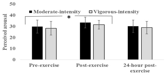 Self-perceived arousal of the moderate intensity and vigorous intensity groups before and immediately after exercise, and at 24-h post-exercise. Error bars indicate the standard deviation. * Main effect of exercise (p < 0.01).