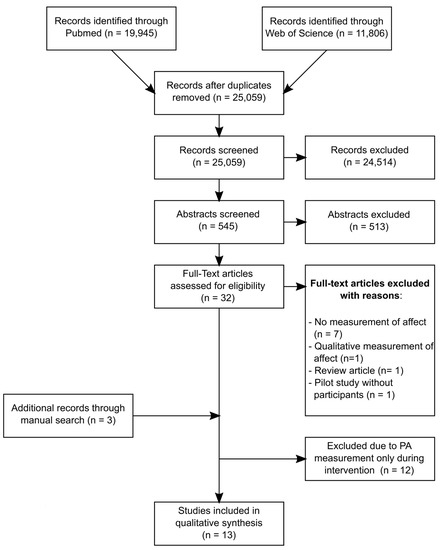 After removing duplicates, a total of 25,059 studies were identified. 545 studies remained after screening titles. Abstract screening yielded 32 full text articles assessed for eligibility. During full text reading, ten studies were excluded for not meeting the inclusion criteria. A further twelve studies did not sufficiently measure PA during the intervention time and were therefore eliminated. Three additional studies were added through manual research by checking references from included studies (see Figure 1). In total, 13 studies were included.