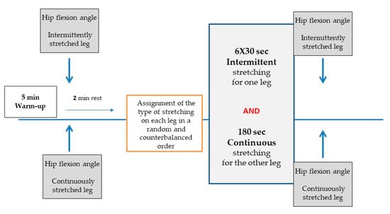 In the main testing session, participants’ hip flexion angle, was assessed using the straight leg raise test, in two conditions: (a) immediately after warm-up, and (b) following stretching intervention. The warm-up included 5 min of jogging at a moderate intensity (50%–60% of maximal heart rate). During testing, participants performed with the one leg the intermittent protocol and with the other leg the continuous stretching protocol. The assignment of the stretching type and the order of legs was done in a random and counterbalanced order. A schematic representation of the study protocol is shown in Figure 1.