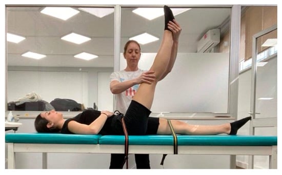 The straight leg raise maneuver was chosen as a valid and reliable test of the extensibility of the hamstrings []. Furthermore, participants were familiar with this stretching movement because they used it in their training sessions. The static stretching protocols were applied and controlled by the same examiners. The straight leg raise was performed from a supine position on a physiotherapy bed, with the knee locked and the lower back flat on the bed (Figure 2). The lower back and the thigh of the non-stretched leg were stabilized with medical straps in order to prevent pelvic rotation. The participant’s head was not supported by pillow. The examiner grasped the participant’s heel of the tested leg with the one hand while with the other hand maintained the knee in an extended position. Slowly the examiner raised the stretched leg by flexing the hip. At the point of discomfort, the examiner maintained the stretch intensity for 30 s. The stretching movement was repeated for five more times, interspersed with 30 s of rest each time. During continuous stretching, the same procedure was followed and when the point of discomfort was reached, participants were instructed and verbally encouraged to maintain the stretch intensity for 3 min in order to induce the largest stretch they were willing to tolerate (Figure 2).