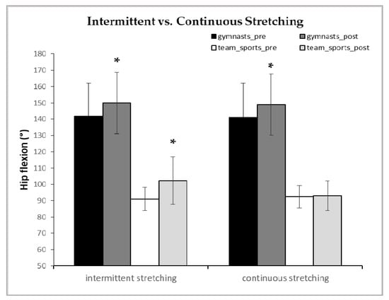 This study examined changes in hip joint flexion angle following an intermittent (6 × 30 s with 30 s rest) or a continuous (180 s) static stretching protocol of equal total duration between artistic and rhythmic gymnasts and team sports athletes. The main finding of this study was that both stretching protocols equally increased hip flexion angle in artistic and rhythmic female gymnasts while only intermittent stretching increased hip flexion angle in team sports athletes.